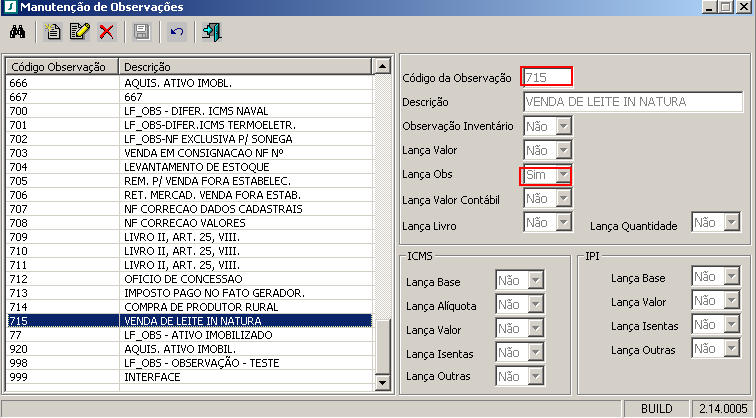 Para que os dados das notas fiscais de venda de leite in natura sejam lidos pelos Livros de Saída, deverá ser efetuada a seguinte parametrização: