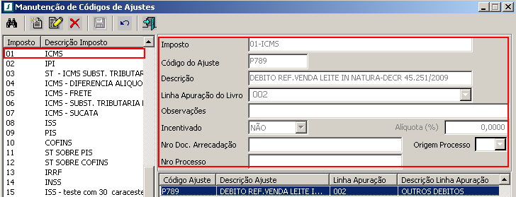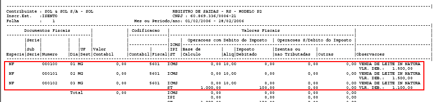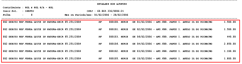 Para cada nota fiscal identificada no Registro de Saídas, como venda de leite in natura, será criado um ajuste, que será escriturado no Registro de Apuração do ICMS (MOD9). O valor do ajuste será o valor total da nota, demonstrado na coluna de observação do Livro Registro de Saídas.