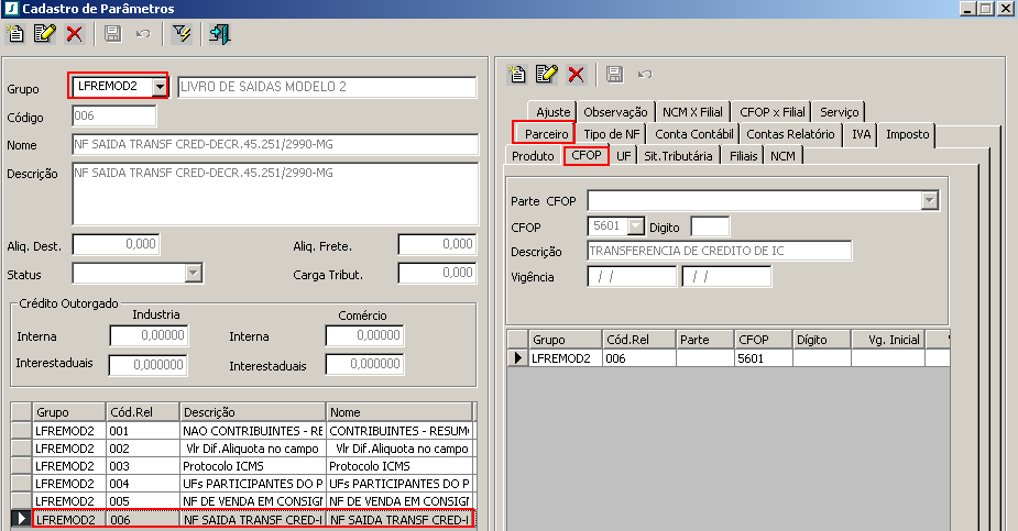 Se for parametrizado também o Código do Parceiro, só serão consideradas nesta regra, as notas fiscais com o CFOP e o Parceiro indicado.