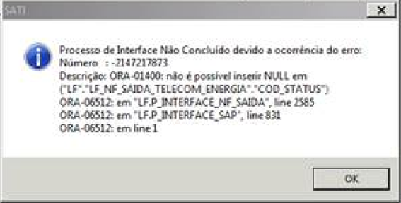 Correção realizada na Interface de Indiretos (Processar Dados) no qual incluímos no objeto ‘P_INTERFACE_NF_SAIDA’ o insert do campo COD_STATUS na tabela LF_NF_SAIDA_TELECOM_ENERGIA, assim o processo será realizado, independentemente da estrutura deste campo.