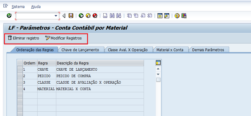 Melhoria realizada, disponibilizando a inclusão de modificar, incluir e excluir as opções na aba de ‘Ordenação das Regras’, via parametrização da conta contábil por material.