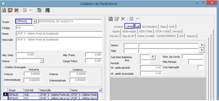Aba CFOP: Cadastrar os CFOP’s de Débito de DIFAL s/ Frete Imobilizado;