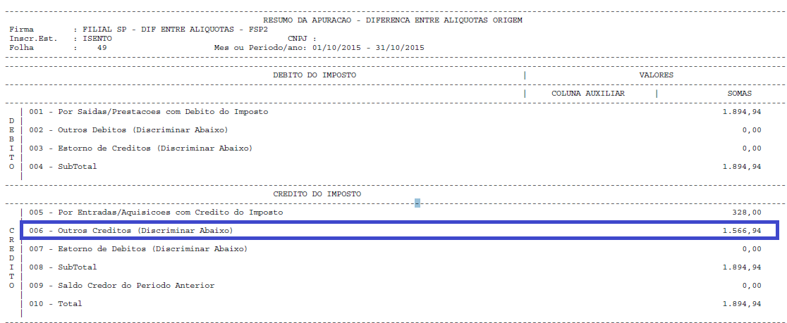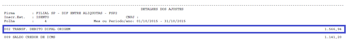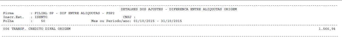 Descrição: TRANSF. CREDITO DIFAL ORIGEM