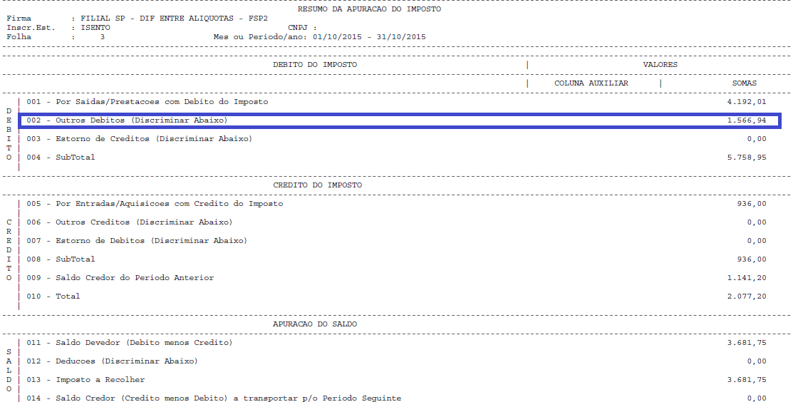 002 – Outros Débitos – Tratando – se DIFAL Origem (Imposto J6)