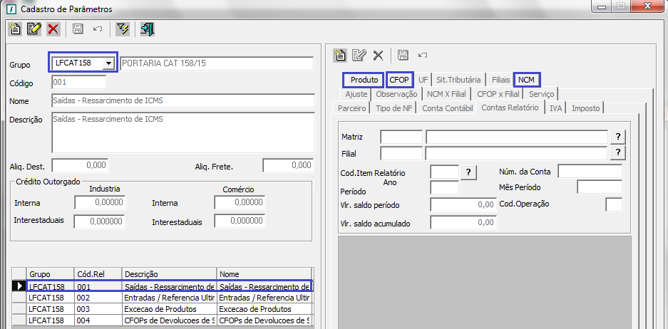 Se não houver parametrização de Produto ou NCM, serão considerados todos os itens das notas fiscais com CFOP’s parametrizados.