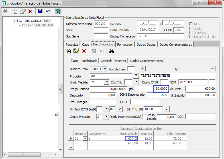 Neste exemplo, o item acima apresentou valor = 0,00.