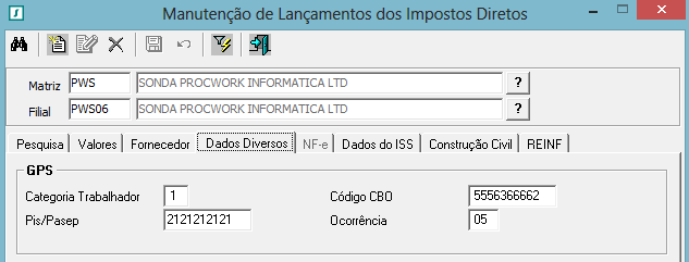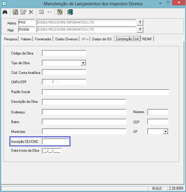 Ao inserir manualmente novo documento na tela de Manutenção de Lançamentos dos Impostos Diretos o sistema carrega os dados cadastrais do Fornecedor para facilitar a digitação e tratamos para não carregar a Inscrição CEI/CNO, para evitar impacto no Evento R-2010 do REINF, conforme demonstrado abaixo: