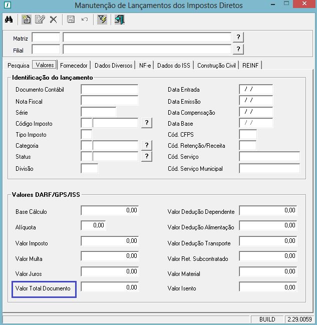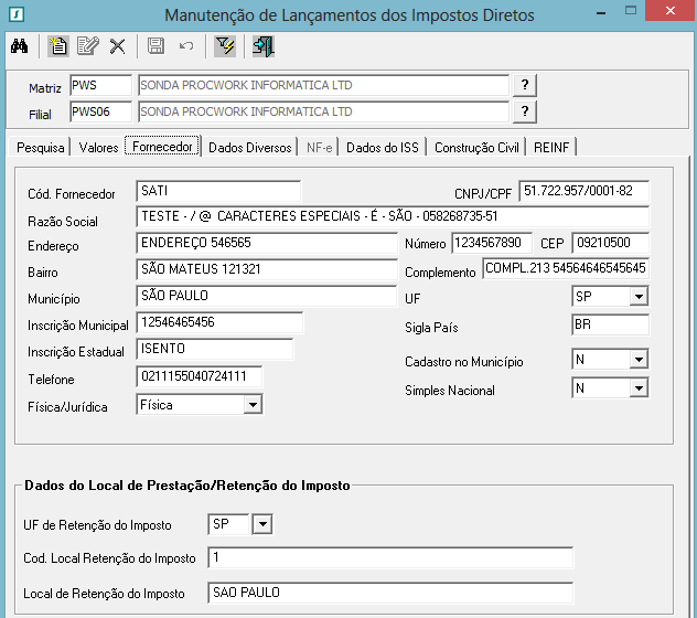 Descrição da Nota: Melhorias efetuadas na tela de Manutenção de Lançamentos dos Impostos Diretos para carregar as informações cadastrais do Fornecedor ao inserir novo documento.