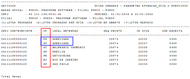 Melhoria efetuada no relatório de Apuração dos Impostos Diretos, na parte do demonstrativo das guias geradas, onde foi incluída a coluna “UF”, para demonstrar a UF do Local de Retenção do Imposto.