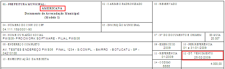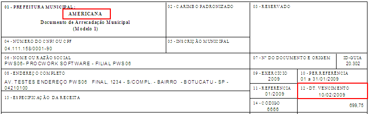 Teste: AMERICANA – MG – Vencimento 10/02/2009