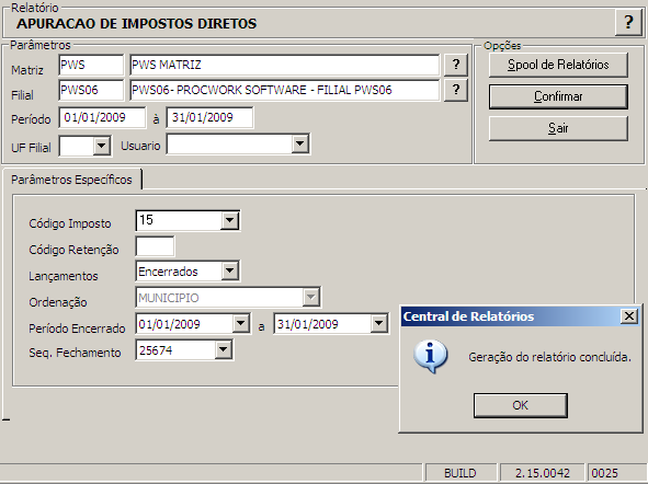 Para geração eventual do relatório de Apuração de Impostos Diretos, seguir o caminho: Relatório > Solicitar