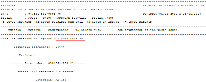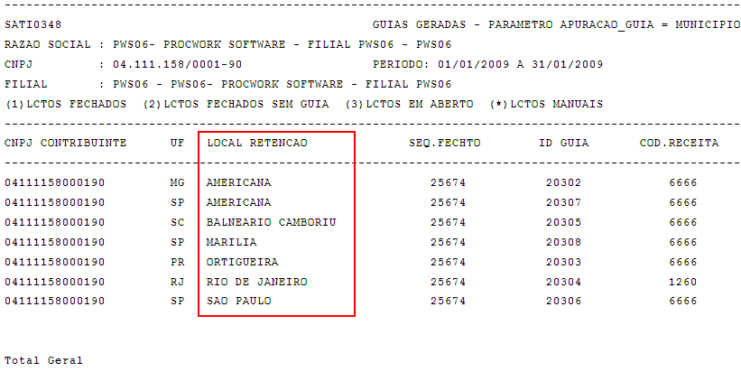 Nos exemplos abaixo, demonstramos que primeiramente foi demonstrado o Município de Americana com Código de Local de Retenção igual a 2 e posteriormente com o Código 9.