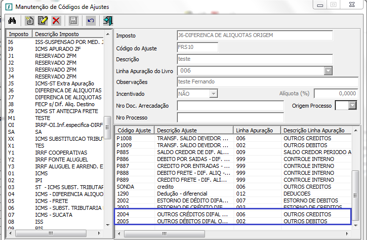 Imposto J6 (DIFAL ORIGEM) deverá ser criado um ajuste de Outros Débitos para linha 002 e Outros Créditos para linha 006.
