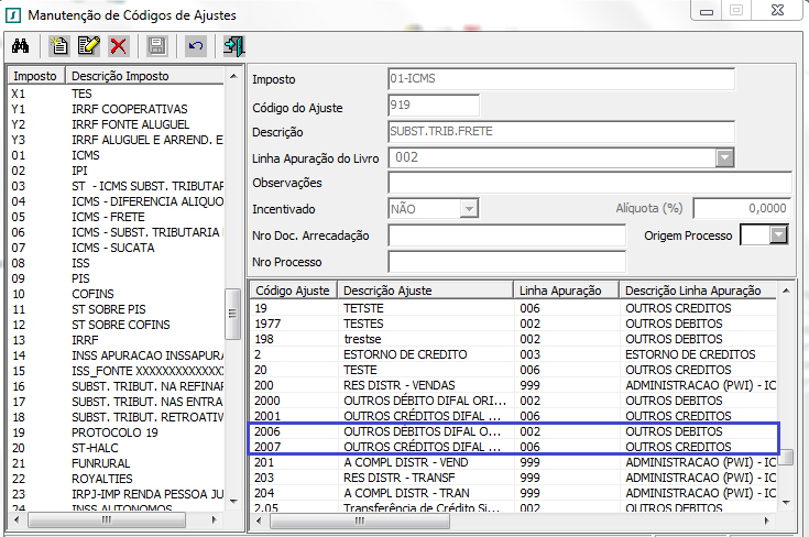 OBS: Para que os ajustes sejam executados corretamente deverá ser feito da seguinte maneira: Crédito para Crédito e Débito para Débito conforme demonstrado a cima. Visando que na apuração do Imposto e dados para o Sped Fiscal o ajuste será demonstrado na linha de apuração correta. EX: Outros Débitos para linha 002 e Outros Créditos para linha 006.