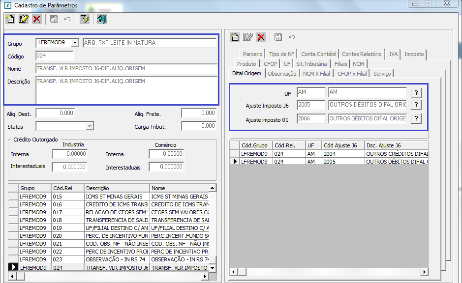 2 – Deverá ser feito um cadastro por UF x Código Ajuste para geração dos ajustes na Apuração de ICMS em Relatórios > Cadastro de Parâmetros > Grupo: LFREMOD9.