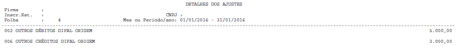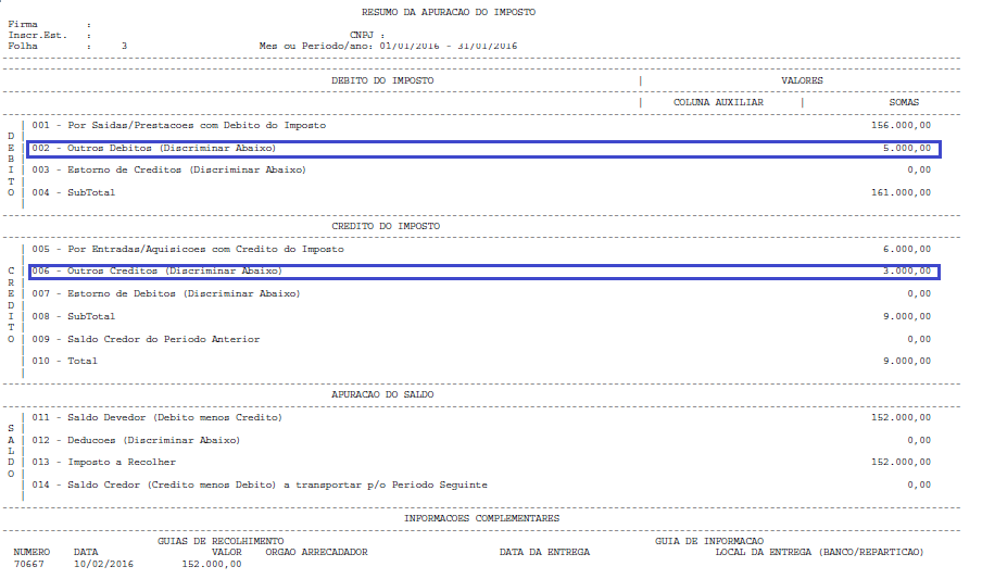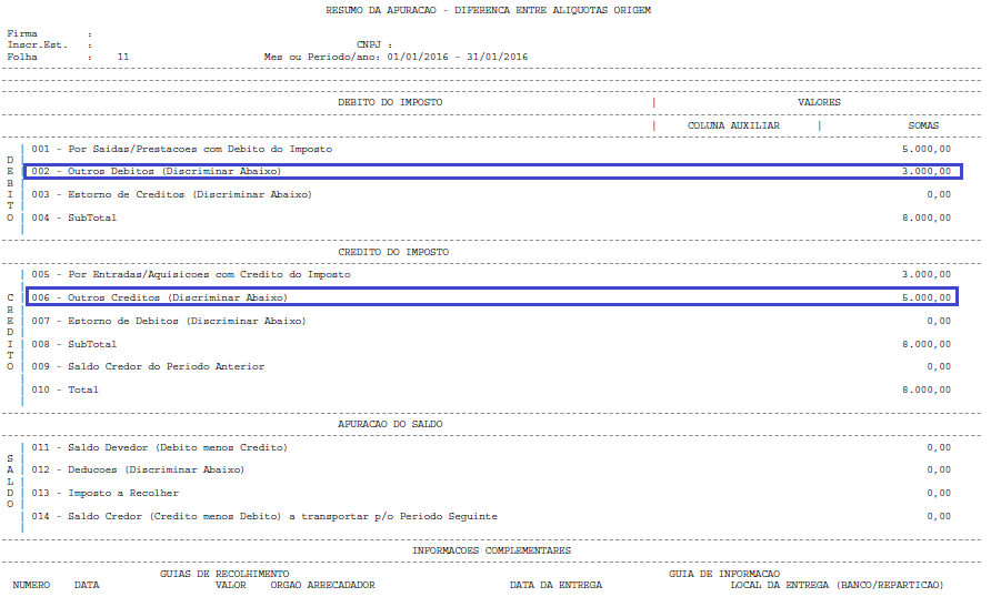 Imposto 01 (ICMS) deverá ser criado um ajuste de Outros Débitos para linha 002 e Outros Créditos para linha 006.