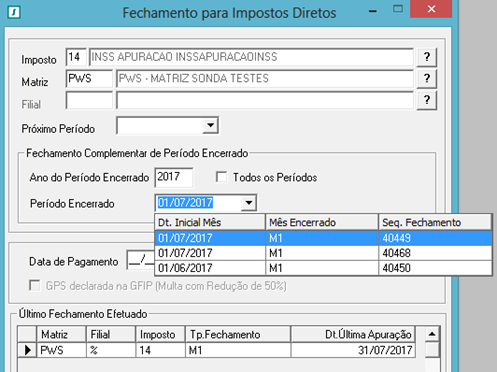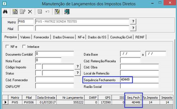 A sequência de fechamento pode ser verificada na tela de Fechamento para Impostos Diretos, conforme exemplo abaixo: