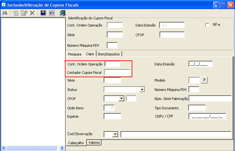Foi incluso o campo Contador Cupom Fiscal e alterado o nome do campo Número Cupom Fiscal para Cont. Ordem Operação na aba Capa, conforme abaixo:
