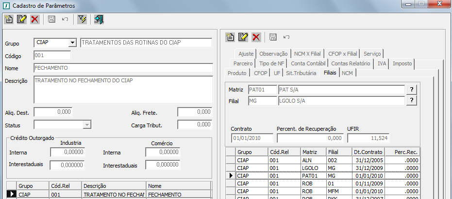 Menu Relatório > Cadastro de Parâmetros > Grupo CIAP > Cód.Rel 001 > Aba Filiais