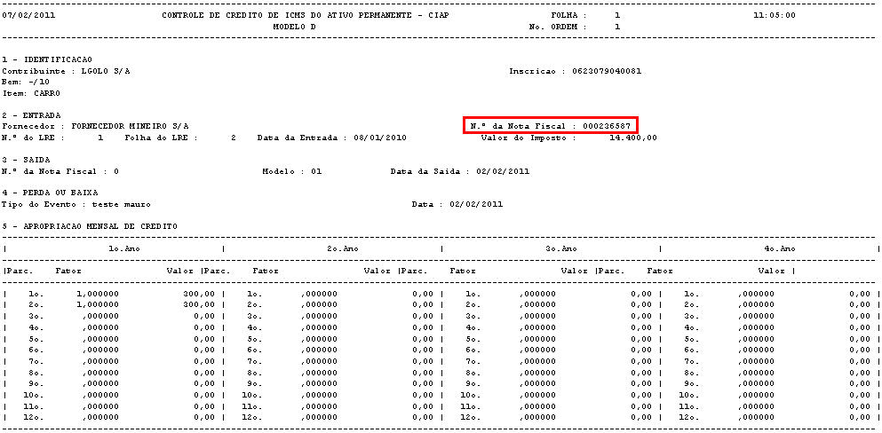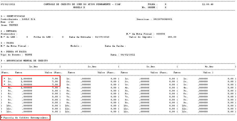 Melhoria efetuada no relatório Modelo D para que o campo Nº da Nota Fiscal reconheça os 9 caracteres da NF-e (A), bem como seja agilizado o processo de identificação de fichas com parcelas relativas à crédito extemporâneo (B).