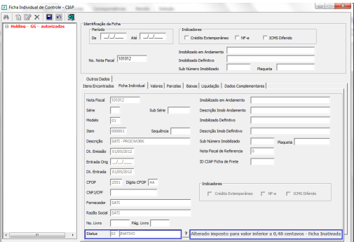 "Alterado imposto para valor inferior a 0,48 centavos – Ficha Inativada".