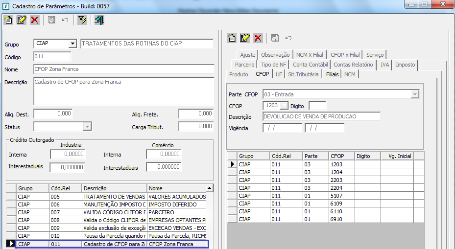 Observação: Para este parâmetro já foram cadastrados os CFOP's 1203, 1204, 2203 e 2204, 5107,6109 ,6110 e 6910.