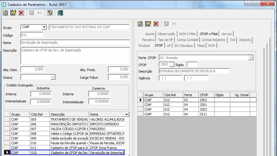 Com o objetivo de permitir o cadastro dos CFOP's utilizados para a Zona Fraca e operações de Devolução de Importação, foram criados os seguintes codrels: