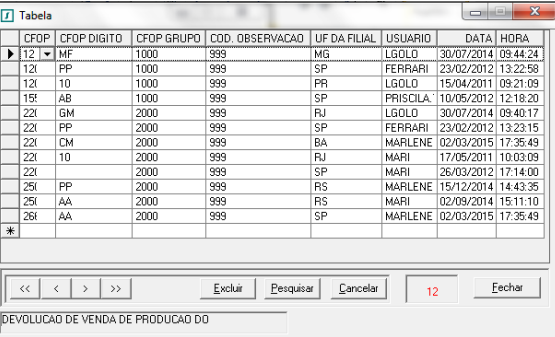 CFOP, CFOP DIGITO, CFOP GRUPO, COD.OBSERVACAO, UF DA FILIAL, USUARIO, DATA ATUAL e HORA.
