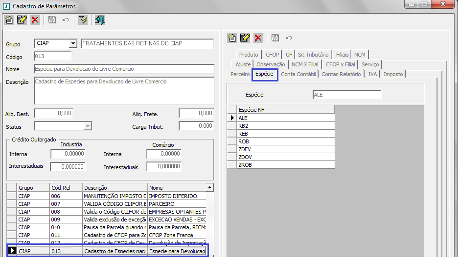 Foi criado no Grupo do CIAP o código de relatório "013 - Cadastro de Espécies para Devolução de Livre Comercio", para serem cadastrados os códigos de Espécie das Notas Fiscais das Operações das Devoluções de Livre Comércio.