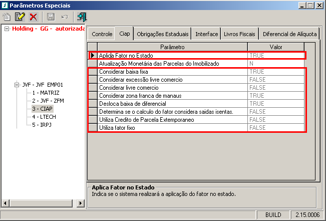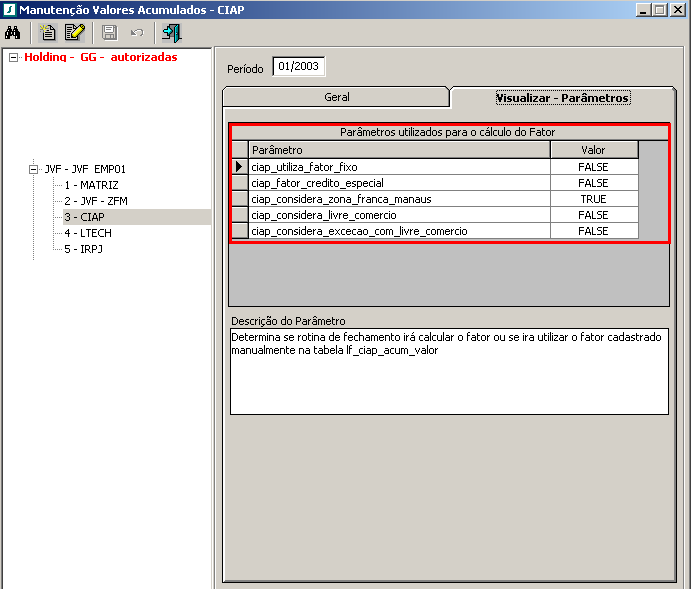 A aba "Visualizar - Parâmetros" da tela de Valores Acumulados, demonstra a parametrização por Holding.