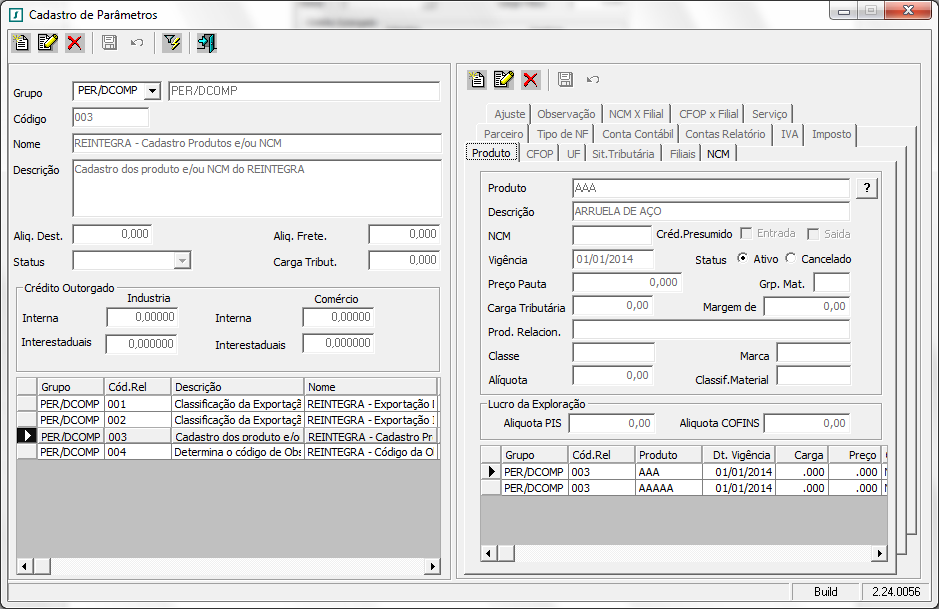 Na tela Cadastro de Parâmetros para o grupo PER/DCOMP, será necessário cadastrar os Códigos dos Produtos e/ou NCM’s e CFOP’s das notas fiscais dos bens exportados competentes ao benefício do REINTEGRA. Caminho: Obrigações>Obrigações>Federais >PER/DCOMP > Parâmetros > Grupo: PER/DCOMP