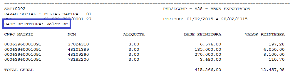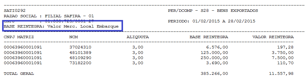 Melhoria no relatório de acompanhamento do registro S28, para demonstrar as notas fiscais de exportação direta com diferentes NCM’s ocasionando repetição do valor da Base de Cálculo do Reintegra.