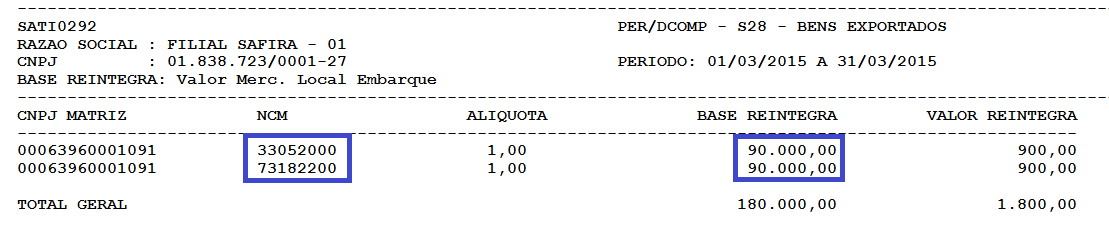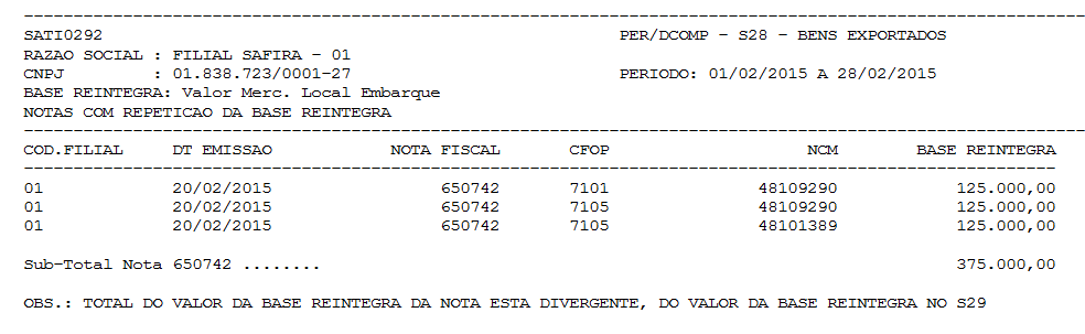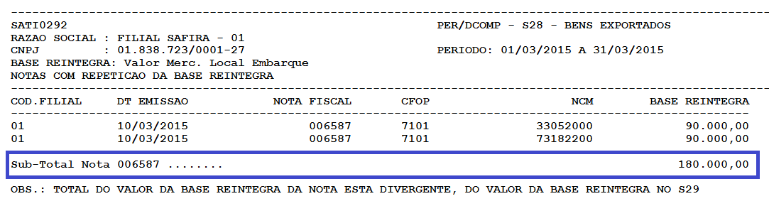 Para Notas Fiscais com mais de um NCM, será apresentado duplicidade no valor da Base de Cálculo do Reintegra no registro S28.