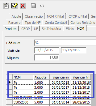 No campo NCM preencher com “%” para identificar que esse percentual é para todos os NCM’s parametrizados para determinada vigência.