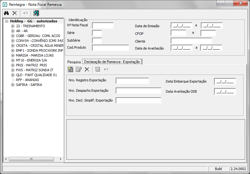 Para complementar os dados referentes à comprovação da exportação, acessar: Obrigações> Obrigações> Federais> PER/DCOMP> Reintegra – Nota Fiscal Remessa.