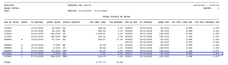 Descrição da Nota: Tratamento efetuado na Apuração Portaria CAT 158/15, para não considerar NF Complementar sem destaque da quantidade.