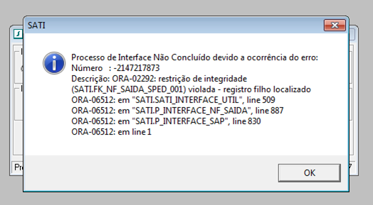 ORA-02292:restrição de integridade(SATI.FK_NF_SAIDA_SPED_001).