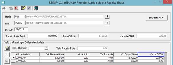 Tratamento efetuado na tela da CPRB, para demonstrar o resultado da percentagem, pois estava efetuando a multiplicação da Base de Cálculo pela Alíquota.
