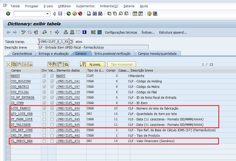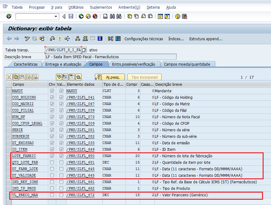 Estrutura do campo para a tabela /PWS/ZLFT_E_SPED: