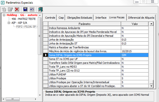 >Gerência >Parâmetros Empresa >Parâmetros Especiais > [Selecione Matriz e Filial] >Livros Fiscais