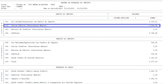 | ICMS Próprio – Linha 002 – Outros Débitos |