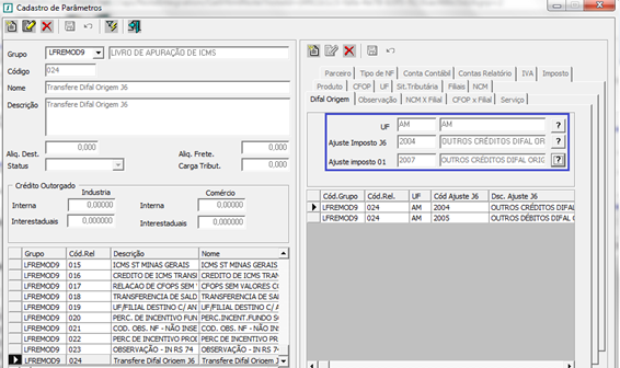 Criar um novo Cód.Rel e preencher as informações na aba “DIFAL ORIGEM”. Para cada estado deverá existir dois ajustes sendo: