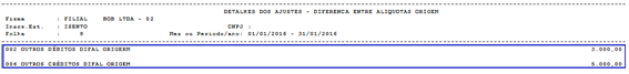 DIFAL ORIGEM deverá ser criado um ajuste de Outros Débitos para linha 002 e outro ajuste de Outros Créditos para a linha 006.