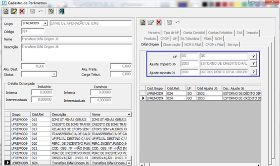 Criar um novo Cód.Rel e preencher as informações na aba “DIFAL ORIGEM”. Para cada Estado deverá existir dois ajustes sendo: