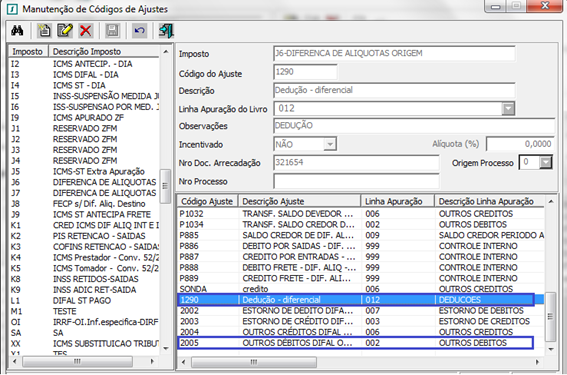 Será necessário a criação de Ajustes manuais para os dois Impostos (J6 e 01), da seguinte forma: