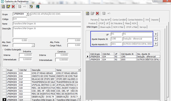 Deverá ser feito um cadastro por UF x Código Ajuste para geração dos ajustes na Apuração de ICMS em: Relatórios > Cadastro de Parâmetros > Grupo: LFREMOD9.
