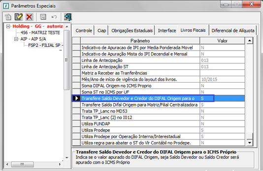 Para transferência do Saldo Devedor e Saldo Credor para o Estado de Santa Catarina foi criado um parâmetro: