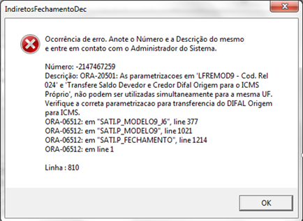 A parametrização em “Parâmetros Especiais” e as parametrizações por UF na tela de “Cadastro de Parâmetros não poderão ser utilizadas simultaneamente para a mesma UF. Caso ocorra este cenário será apresentado a seguinte mensagem no Fechamento de Indiretos: