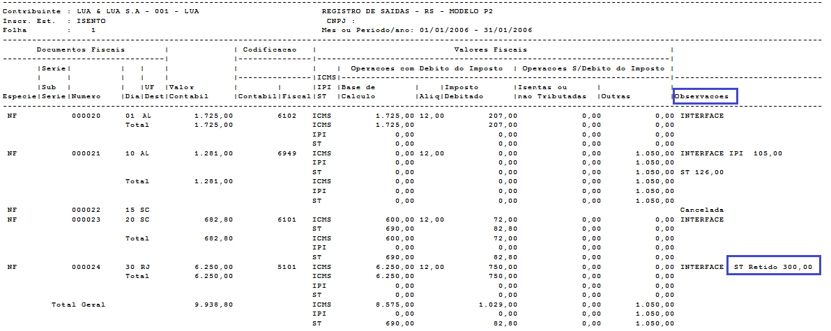 Serão gerados somente as regras nos Livros de Entradas e Saídas, a identificação na coluna de Observações.