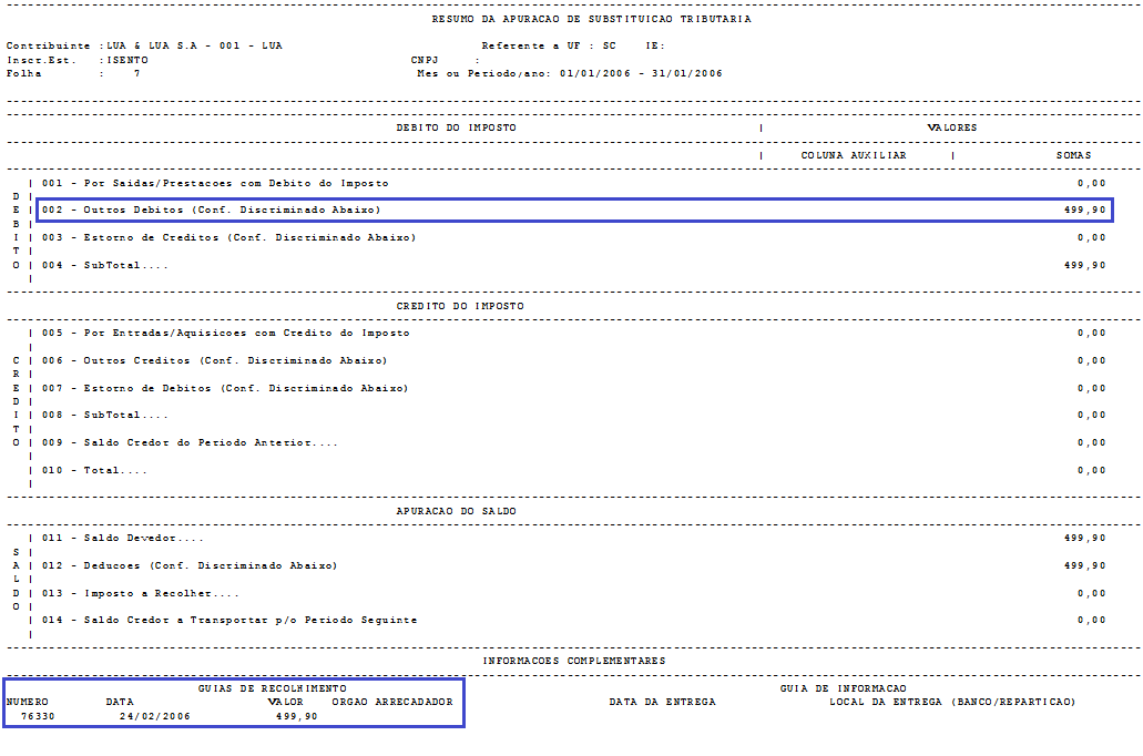 Quando houver imposto a recolher apurado, será gerado também um ajuste de dedução para a Linha 012 da apuração, de forma que seja gerado guia de recolhimento exclusiva para este imposto.